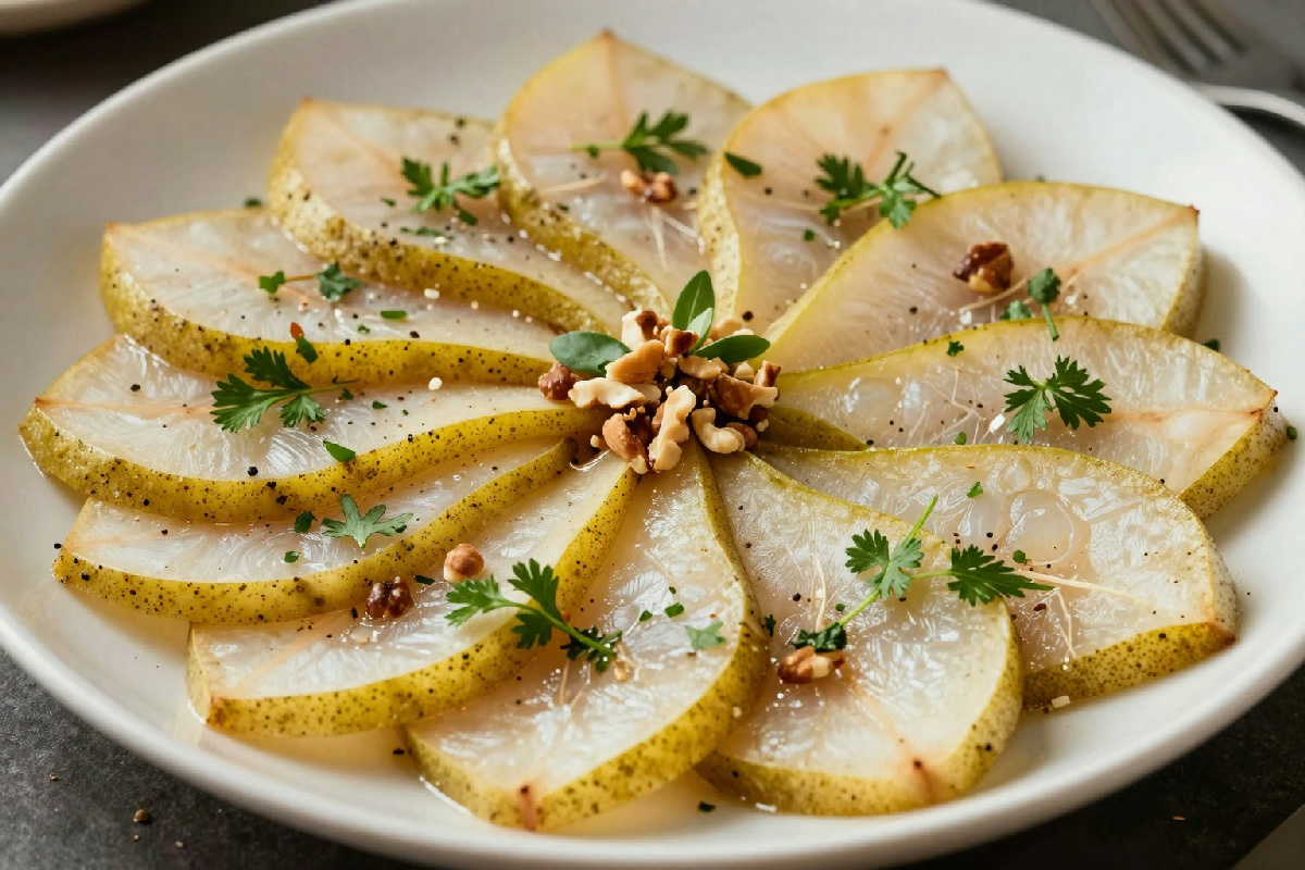 Infine, il carpaccio di pere può essere servito in vari contesti: come antipasto, piatto principale leggero o anche come dessert se abbinato a ingredienti dolci come yogurt greco e miele. La sua versatilità lo rende ideale per ogni occasione, da un pranzo informale a una cena elegante. E chissà, magari il tuo carpaccio di pere diventerà il piatto forte dell’estate!